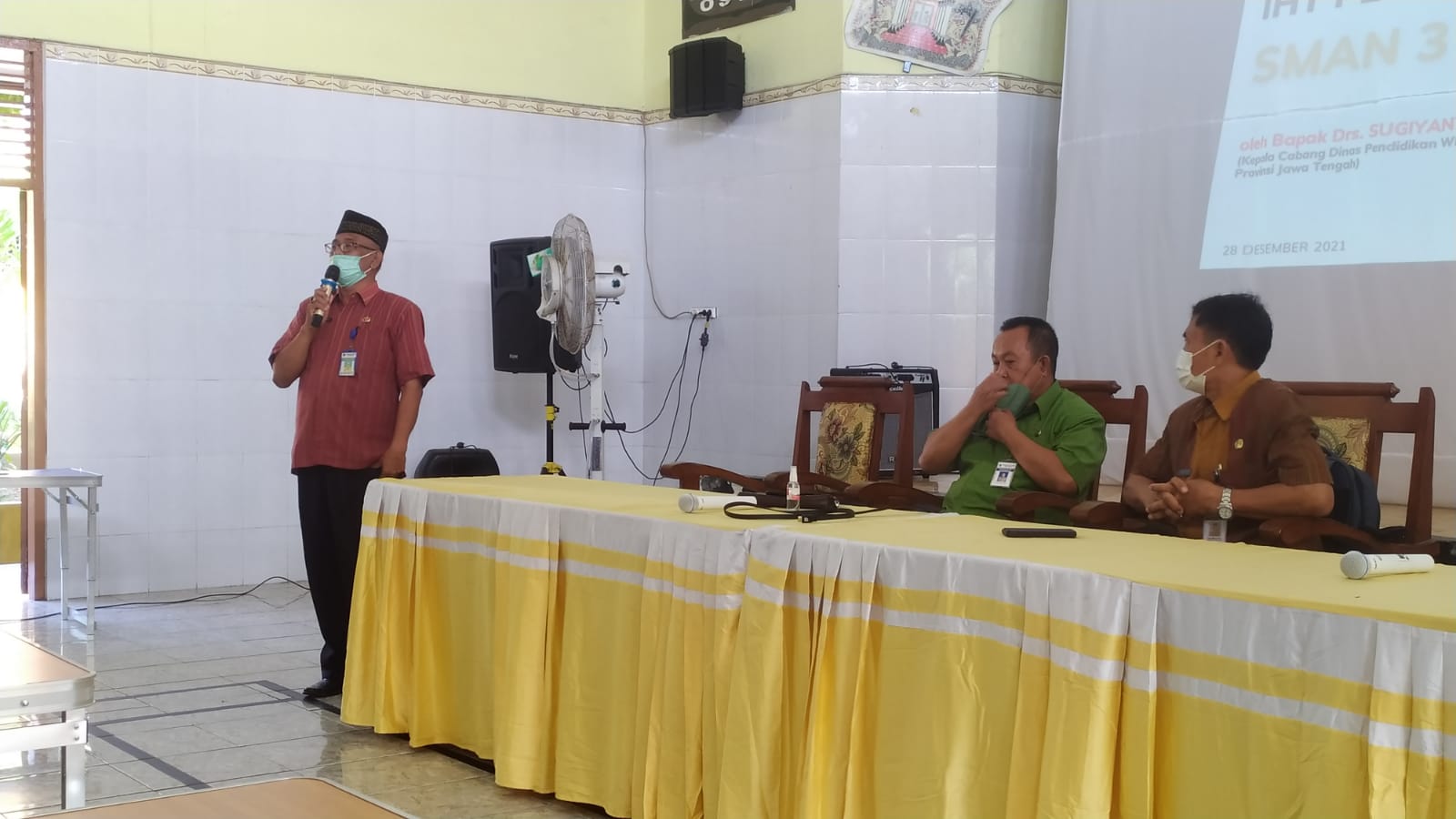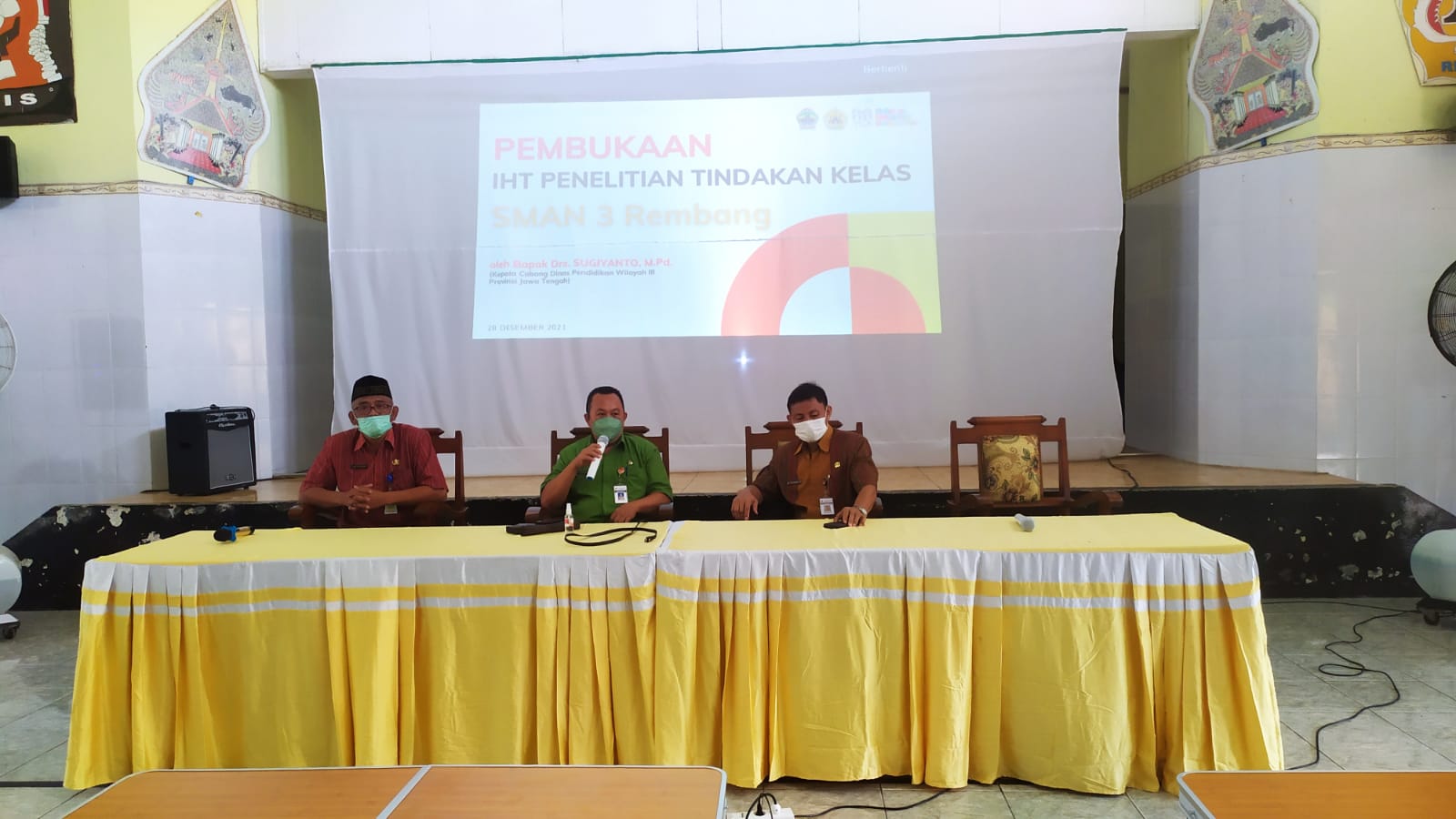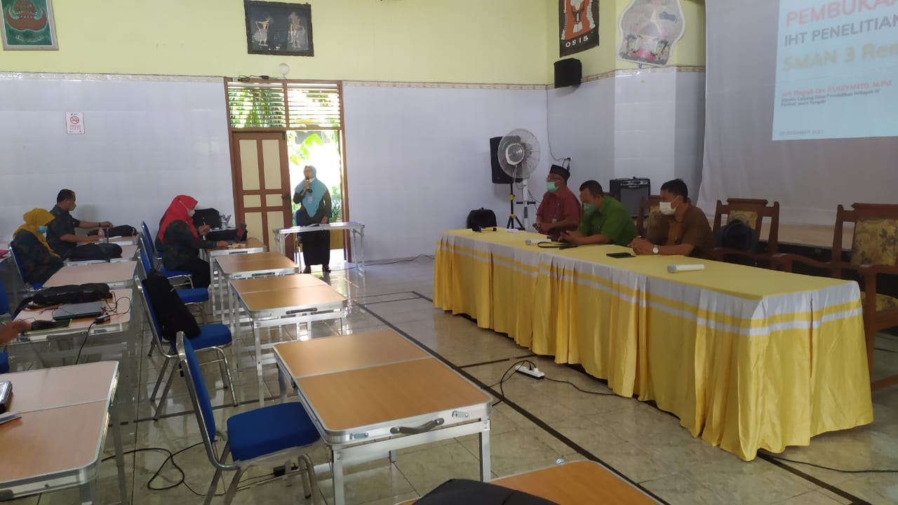 www.sma3rembang.sch.id, Rembang, Humas Smaga. Selasa, 28 Desember 2021. SMAN 3 Rembang mengadakan In Hause Training Penelitian Tindakan Kelas. Kegiatan ini berlangsung selama dua hari yaitu pada tanggal 28 dan 30 Desember 2021 serta dilaksanakan di Aula Graha Bhakti Praja SMAN 3 Rembang. IHT ini dihadiri oleh Kepala Cabdindik Wilayah III Provinsi Jawa Tengah Dra. Sugiyanto, M.Pd, Sukarno, M.Pfis selaku narasumber, Plt Kepala Sekolah Alek Suhartono, M.Pd, Wakil Kepala sekolah,serta bapak/ibu guru. kegiatan ini dilaksanakan dengan mematuhi protokol kesehatan karena masih dalam situasi pandemi covid-19. Acara ini dilaksankan dalam upaya meningkatkan Sumber Daya Manusia (SDM) guru SMAN 3 Rembang.